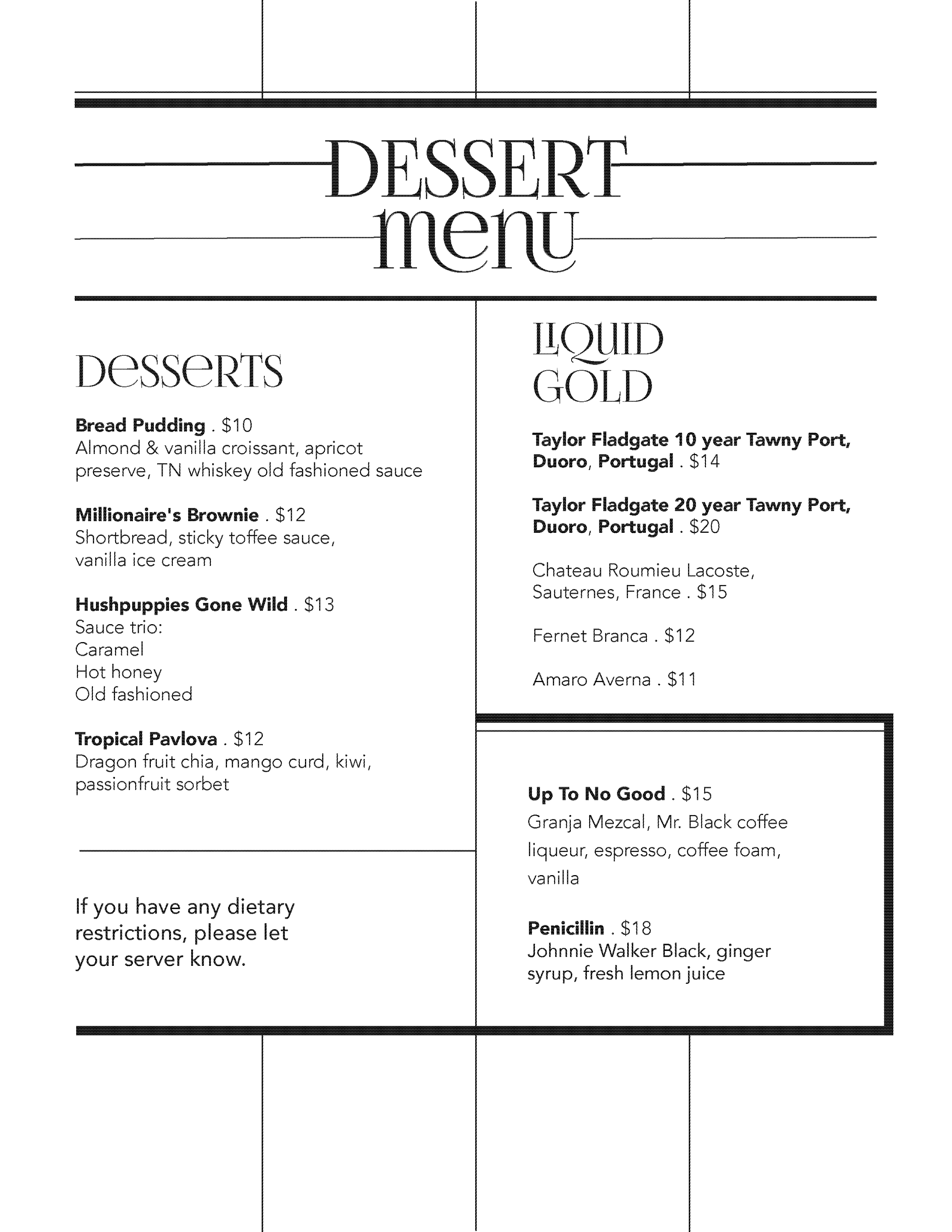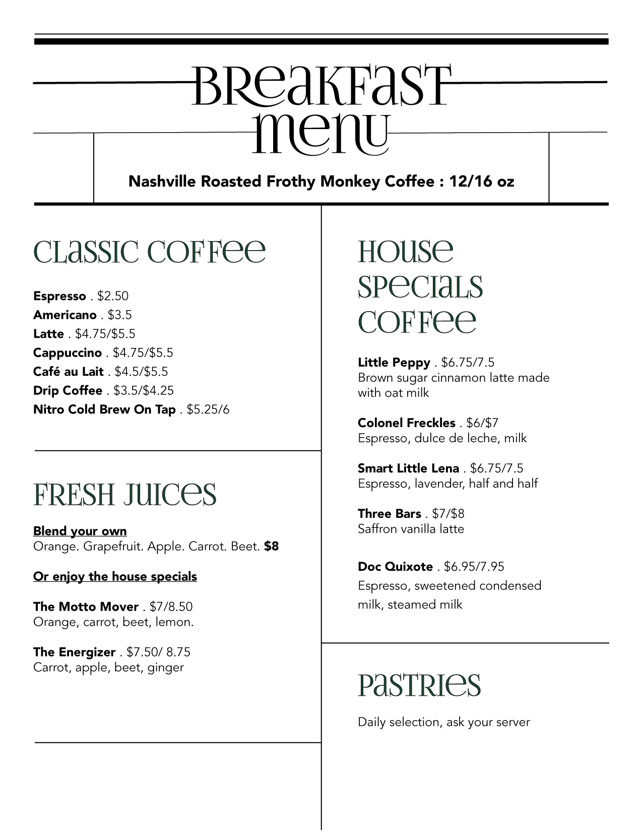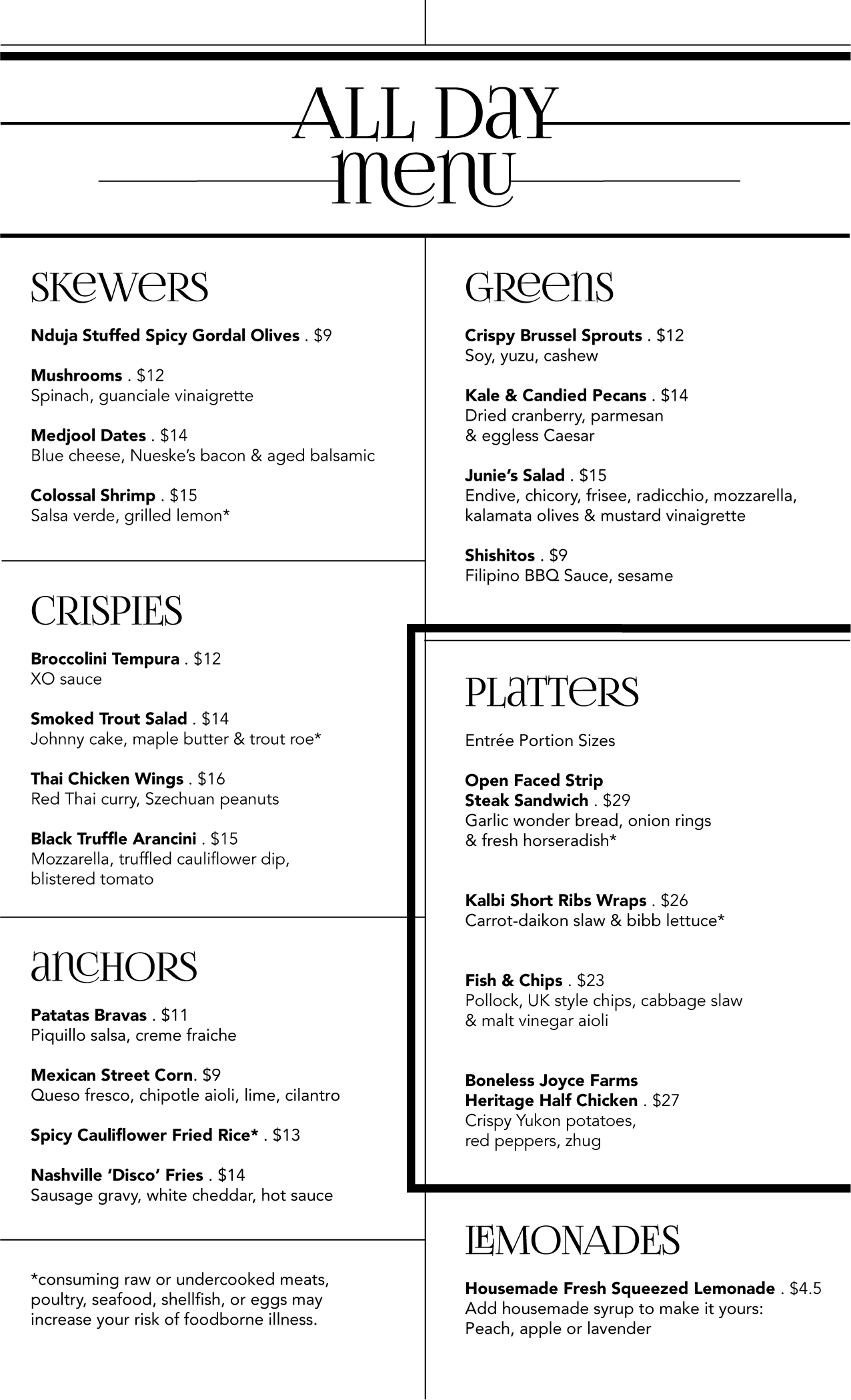 MenuFrom morning light to late at night, our menus were designed with flavor and flexibility in mind. Brunch All Day Drinks